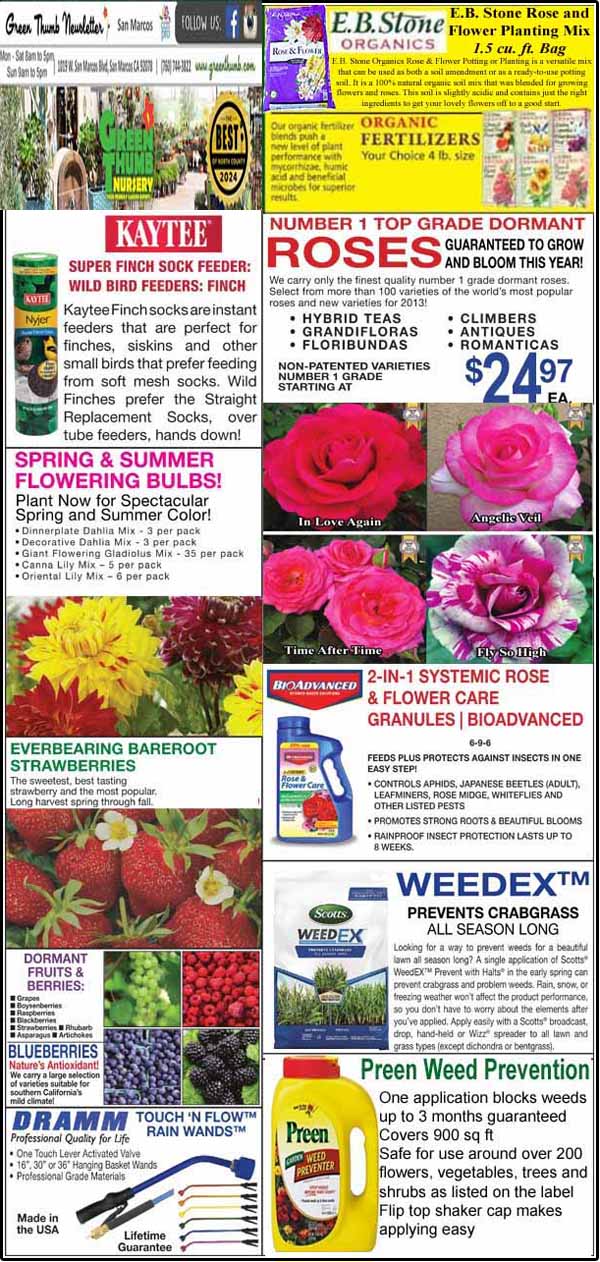Garden center newsletter featuring various products: bird feeders, rose plants, flowering bulbs, strawberry plants, herbicides, and fertilizers. Includes prices and promotional text.
