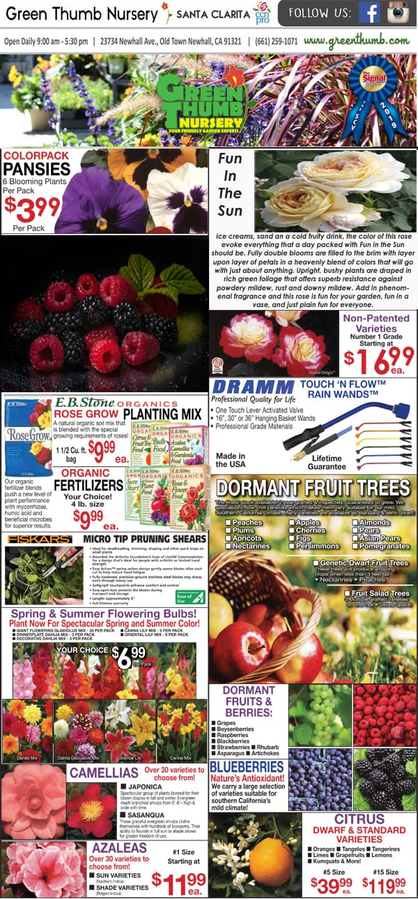 A flyer showcasing a diverse selection of flowers and plants available at a nearby garden center or nursery.