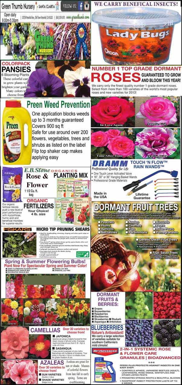 Colorful nursery advertisement showcasing various plants, including roses and pansies. Features images of gardening products, fruit trees, and flowering shrubs. Contact details and website included.