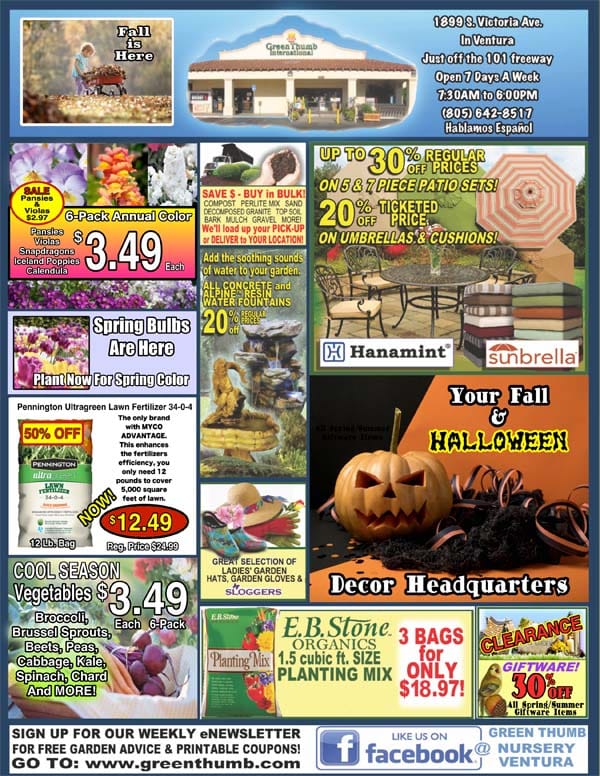 A flyer showcasing a wide range of items for sale at a Southern California plant nursery.