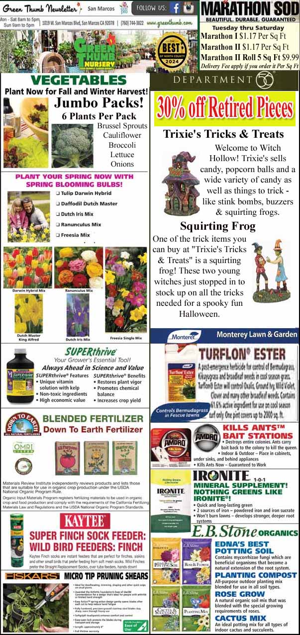 Newsletter page featuring gardening tips, plant sales, and product advertisements, including sod and bird feeders. Colorful images of plants and gardening products are displayed throughout.