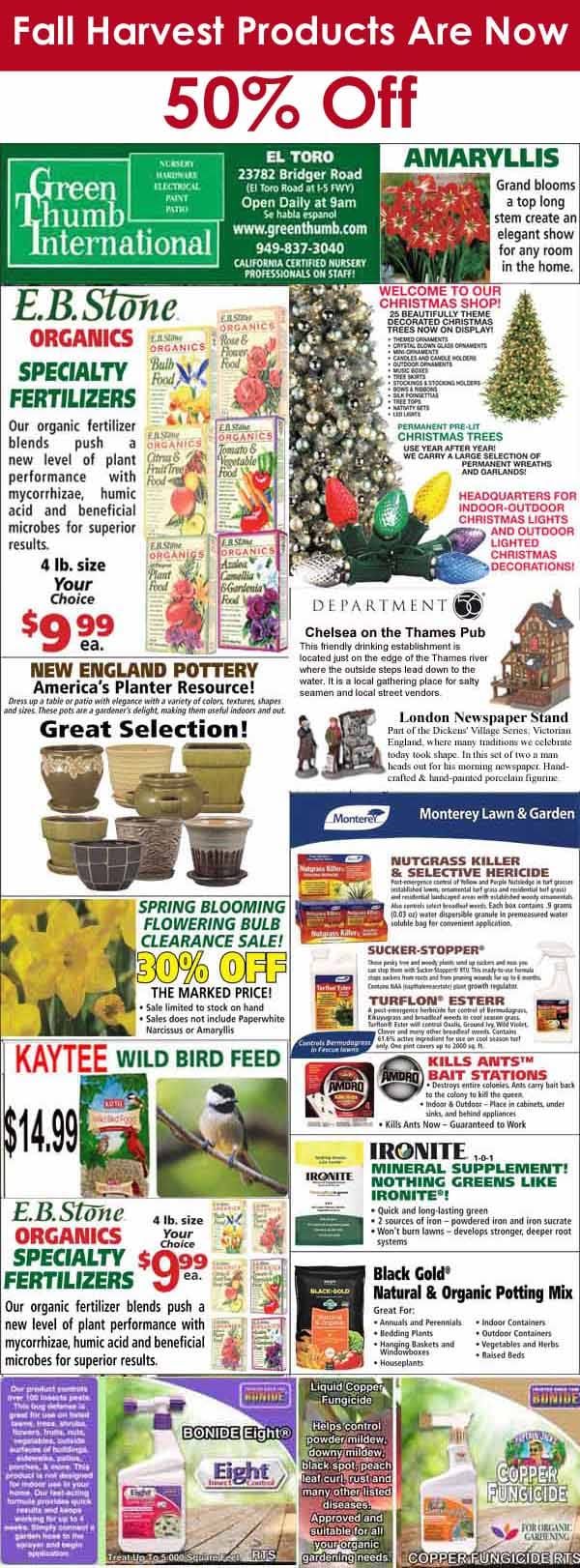 Flyer advertising fall harvest products at 50% off, featuring fertilizers, garden supplies, bird feed, potted plants, and live Christmas trees from various brands and garden centers.