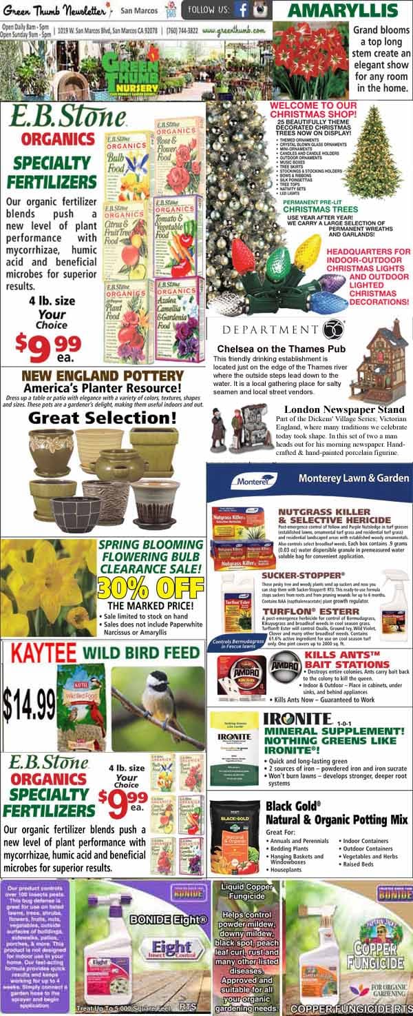 A gardening newsletter page with ads for fertilizers, pottery, flowering bulbs, wild bird feed, lawn care, and coupons, plus a sidebar promoting local garden centers and a pub event.