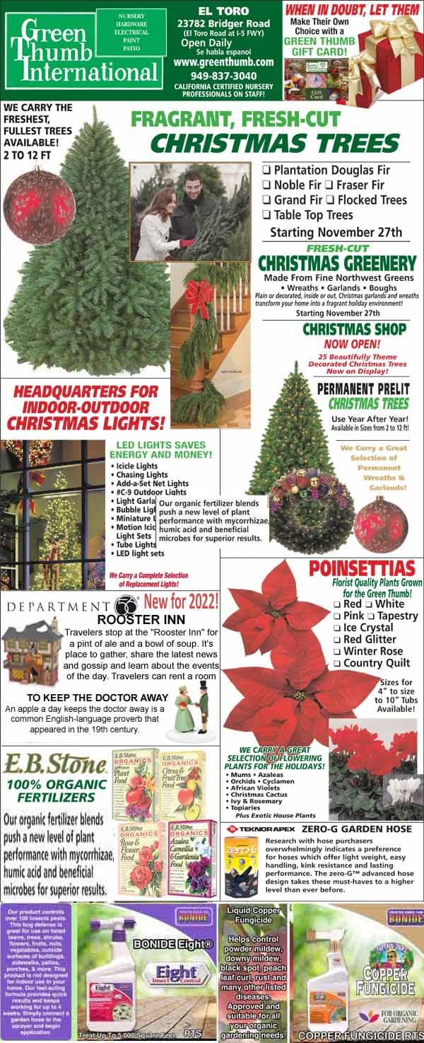 A promotional flyer for Green Thumb International featuring Christmas trees, poinsettias, lights, gardening products, store details, and sale information on a festive holiday-themed layout.