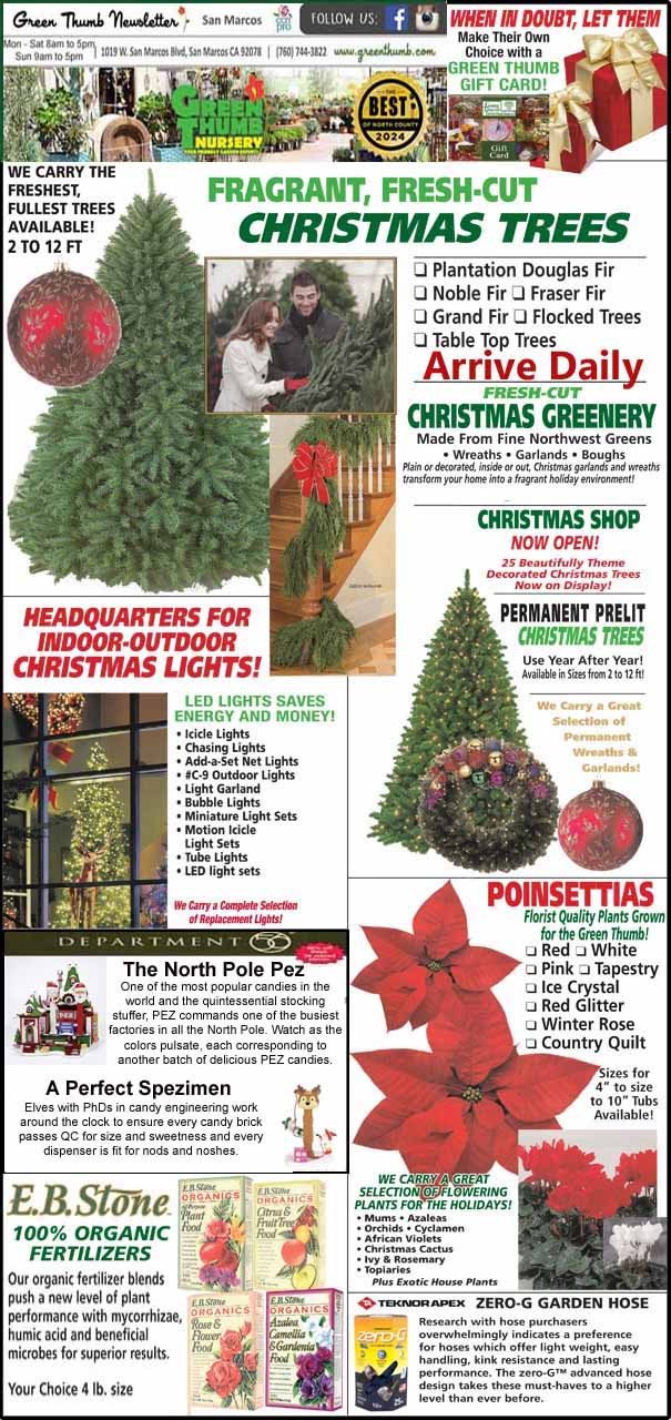 A newsletter showcasing the sale of Christmas trees, greenery, poinsettias, and garden supplies with various offers and contact details for Green Thumb Nursery in San Marcos.