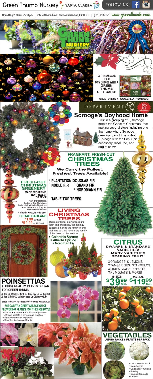 A flyer showcasing a variety of Christmas decorations available at a top SoCal garden center.