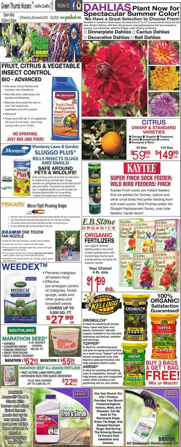 Garden supply store ad featuring flowers, plants, pruning tools, fertilizers, insect control, weed killers, and gardening product prices with colorful images and text.