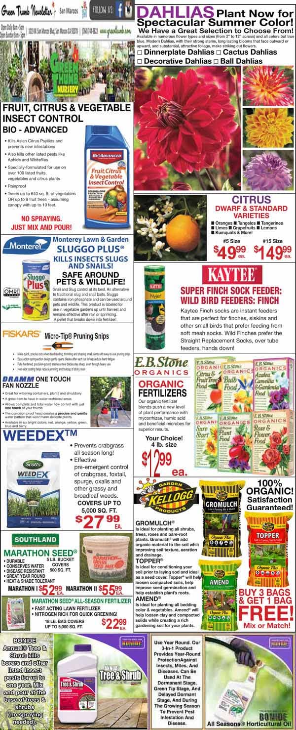 A garden store flyer features product ads for dahlias, citrus trees, fertilizers, insect controls, weed killers, pruning tools, and organic garden supplies with prices and images.