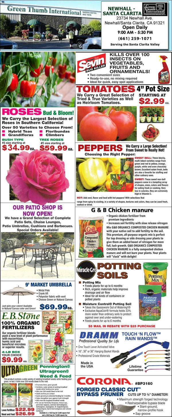 A flyer for a Southern California garden center offering a variety of plants and flowers.
