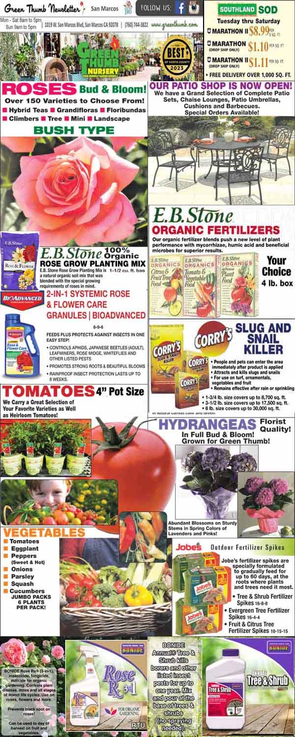 A collage of various gardening product advertisements featuring flowers, fertilizers, and plant care essentials.