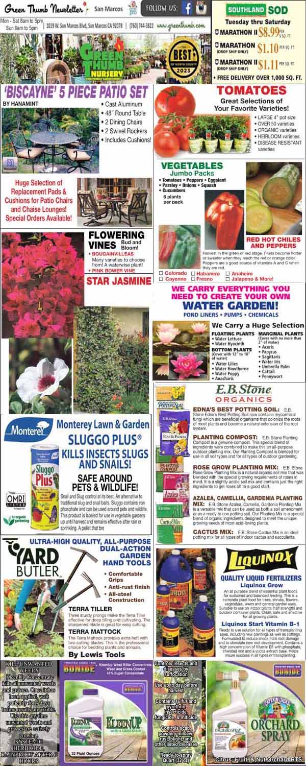 Collage of gardening supply advertisements featuring plants, fertilizers, and garden tools.