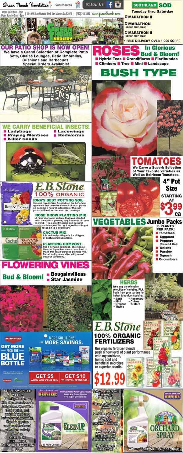 Garden supply store flyer featuring patio furniture, roses, tomatoes, vegetables, flowering vines, organic fertilizer, pest control products, and promotional prices throughout the page.