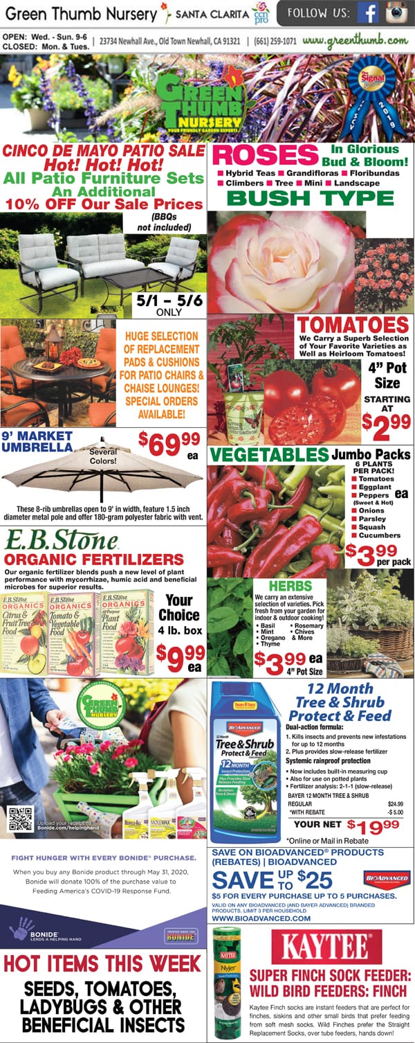 The front page of a newspaper showcasing a variety of plants and flowers available at a Southern California garden center.
