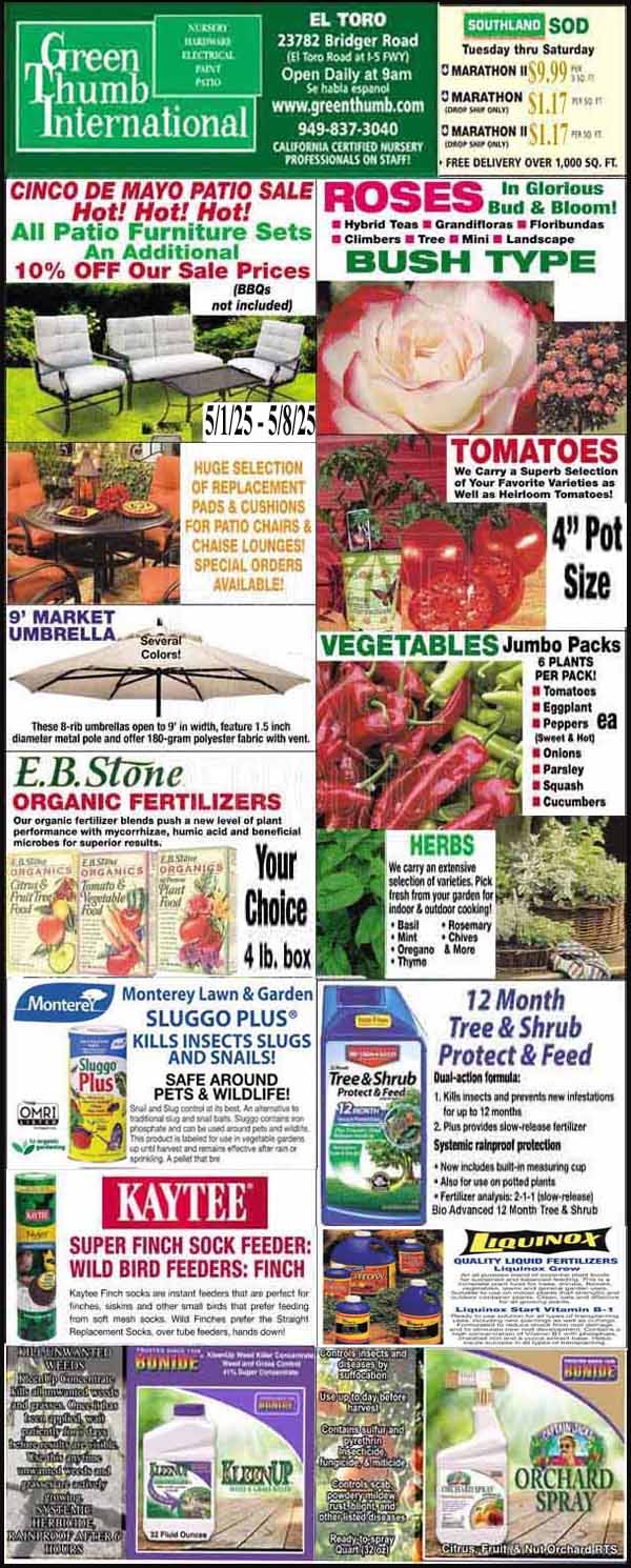 Green Thumb International store ad featuring patio furniture sale, garden supplies, fertilizers, tomato plants, vegetable packs, herbs, and various gardening products with prices and details.