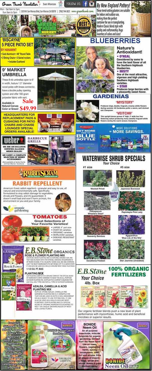 An advertisement flyer featuring various garden products and outdoor furniture, including patio sets, blueberry plants, gardenias, tomato plants, rabbit repellent, organic fertilizers, and bonsai starters.