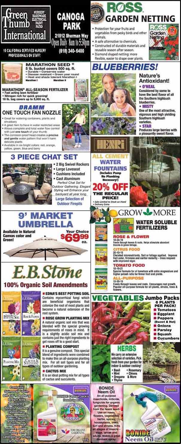 A multi-section advertisement featuring gardening supplies, such as garden netting, blueberries, fan nozzles, soil amendments, market umbrellas, vegetable jump packs, and fertilizers, from various brands.