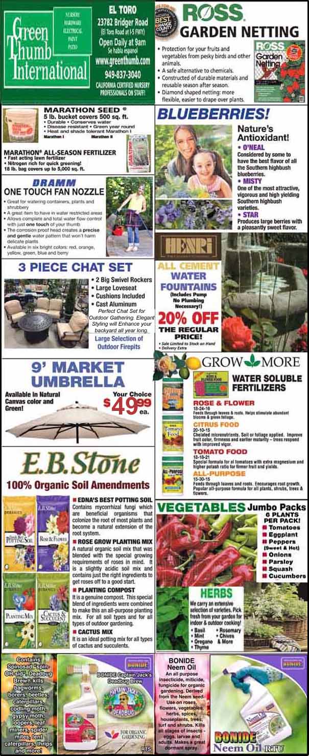 A collage of Green Thumb International gardening products and advertisements. Includes fertilizers, garden tools, vegetables, a market umbrella, a garden netting, blueberry plants, soil amendments, and watering supplies.