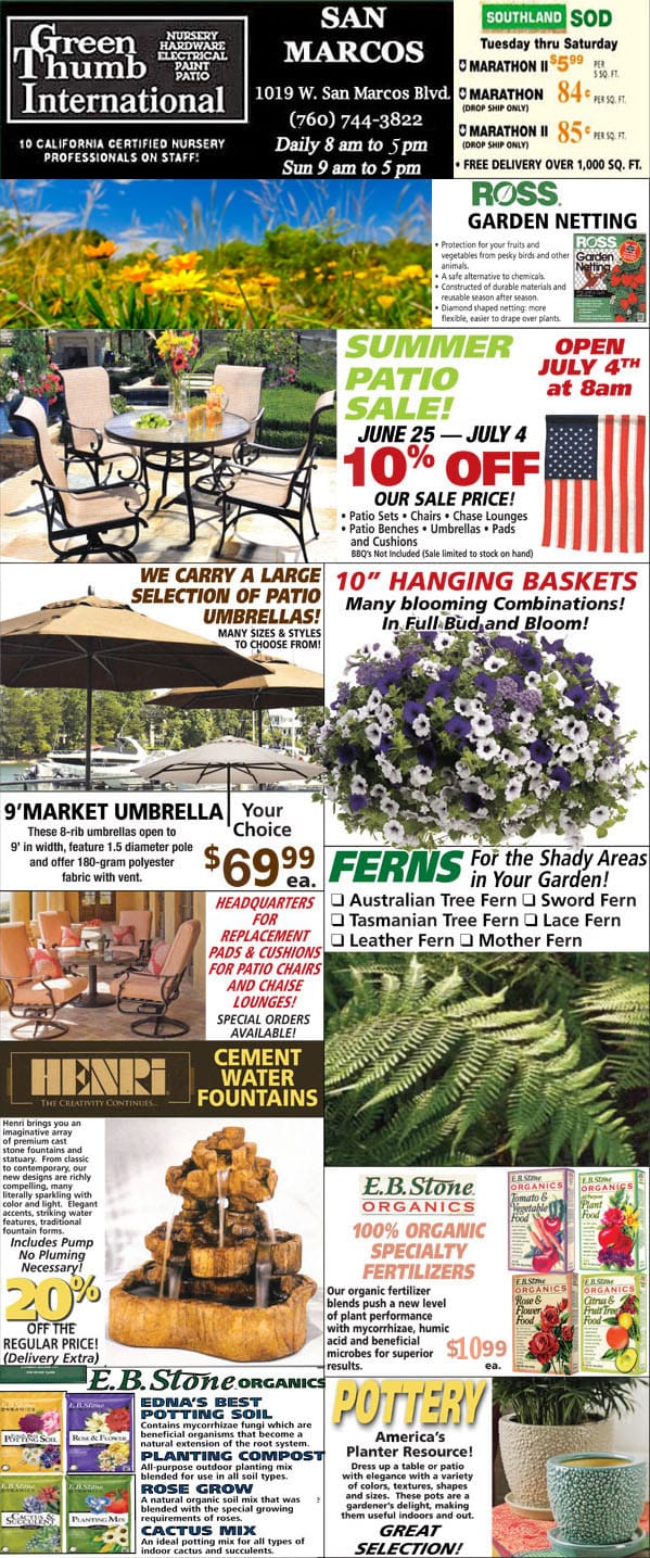A flyer advertising a Southern California plant nursery with a variety of items for sale.