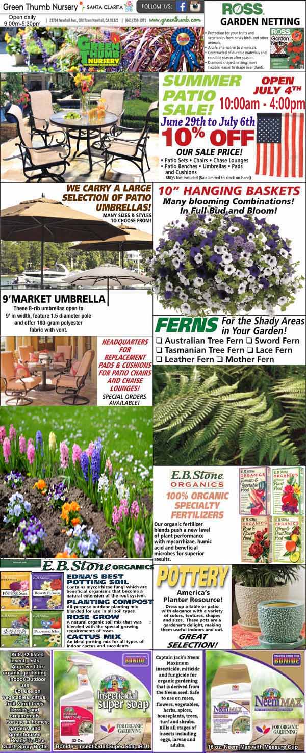 Collage of garden center ads featuring patio furniture, umbrellas, hanging baskets, ferns, pottery, flowers, plant food, and sale details, with images of plants and outdoor displays.