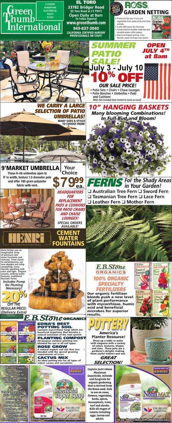 A garden supply store flyer featuring outdoor furniture, umbrellas, hanging baskets, garden netting, fountains, ferns, pottery, seeds, and plant care products with summer sale details.