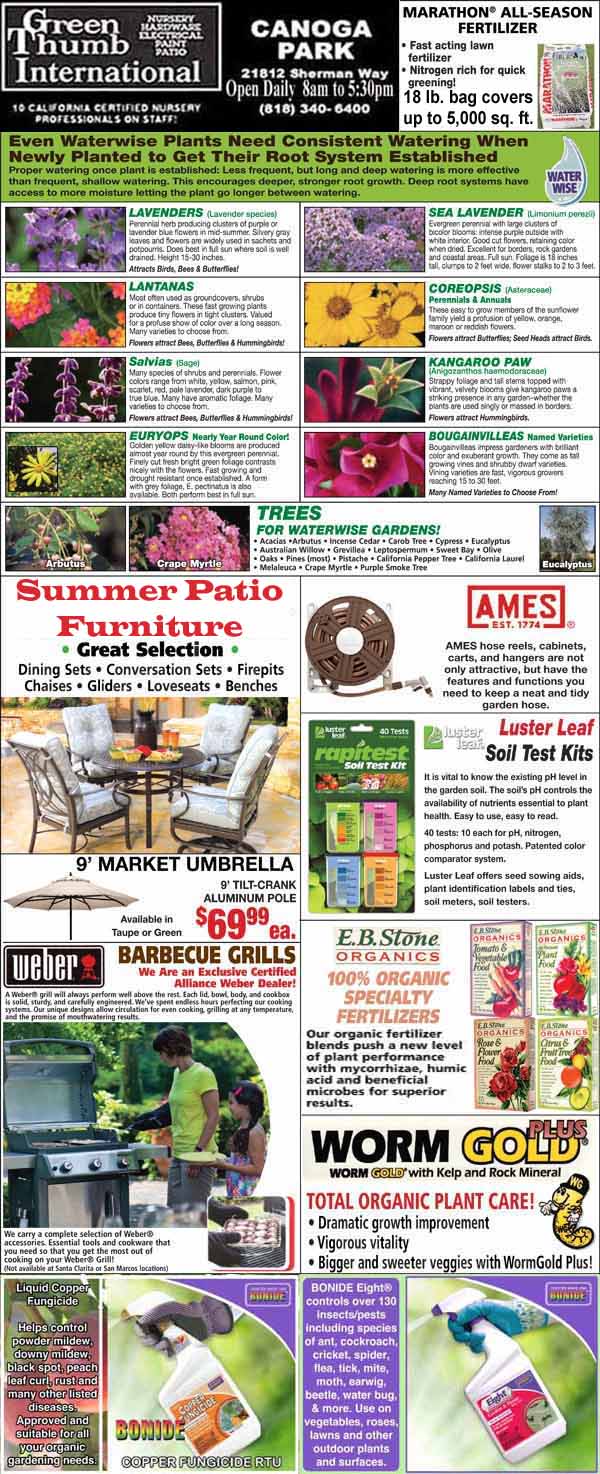 Flyer featuring various gardening products including plants, soil test kits, patio furniture, barbecue grills, organic worm gold fertilizer, and garden accessories.