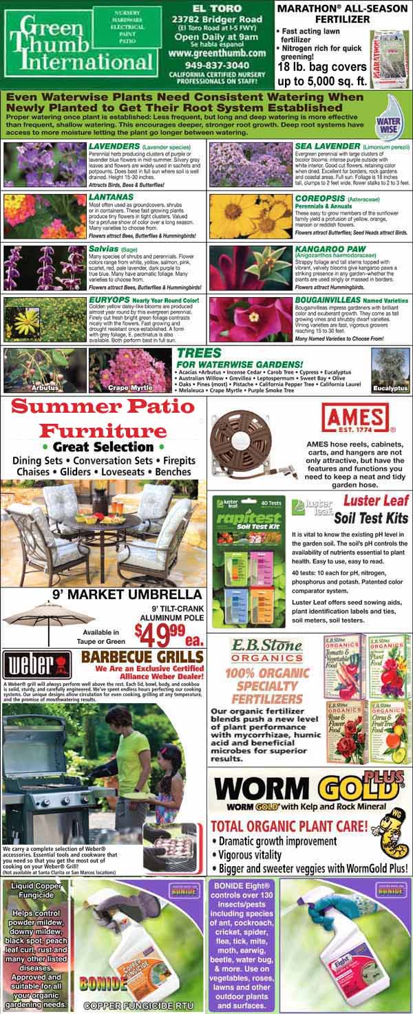Magazine page featuring Green Thumb International store advertisement with sections on plants, fertilizers, patio furniture, soil test kits, barbeque grills, and gap-filler soil. Contact info and prices listed.