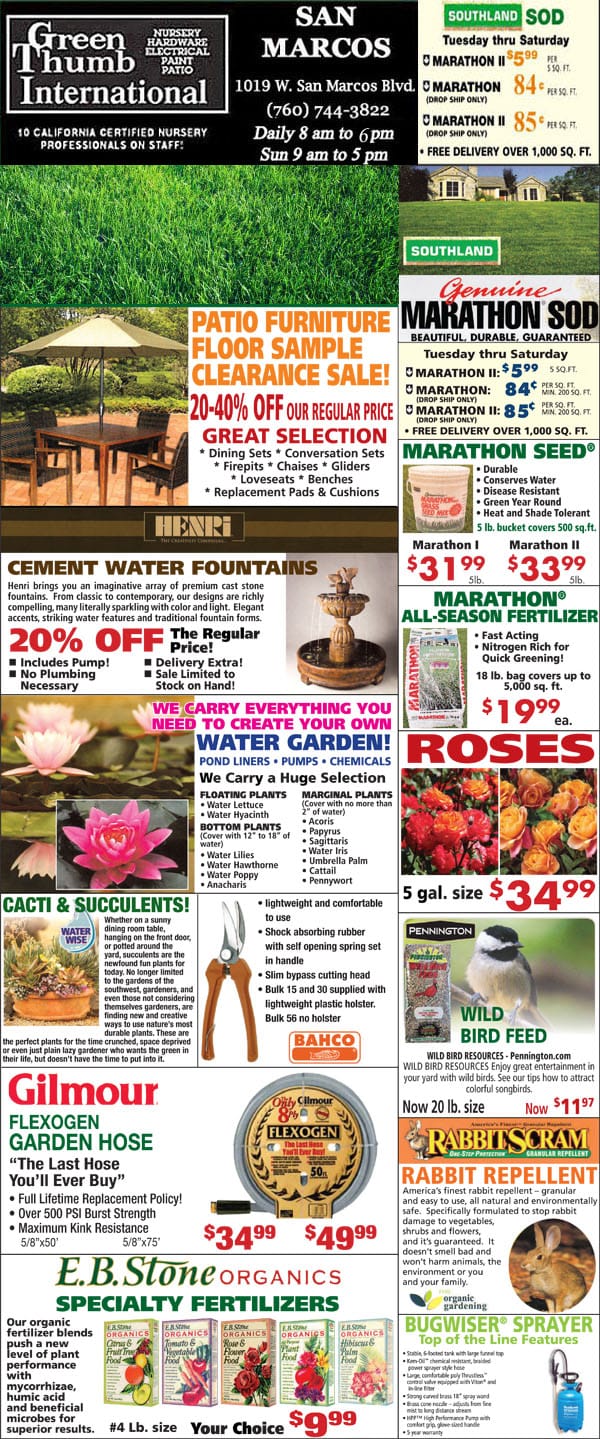 A flyer advertising a Southern California garden center's variety of items for sale.