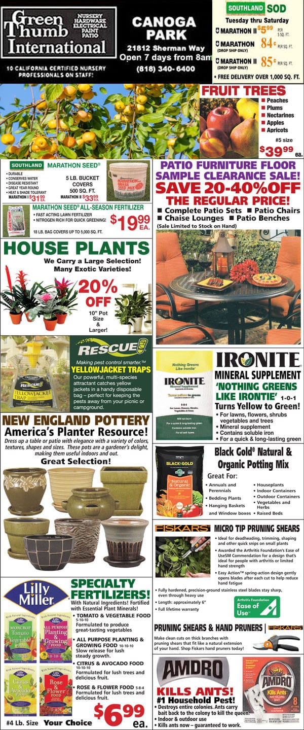 Front page of newspaper with variety of plants and flowers in a Southern California garden center.