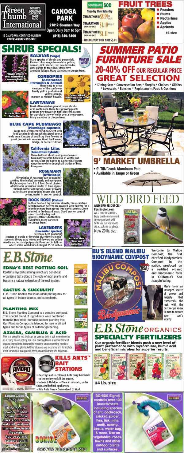 Garden center advertisement featuring plant specials, fruit trees, patio furniture sale, bird feed, fertilizers, pest control, and organic gardening products, with store contact information.