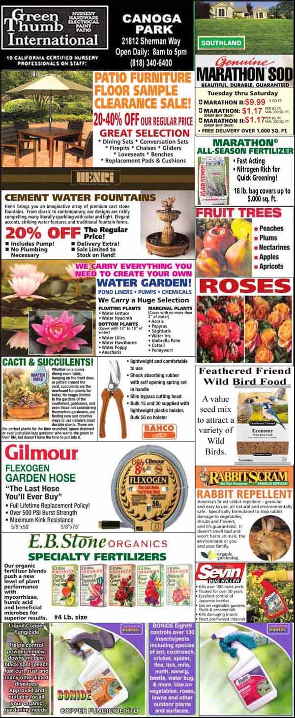 A collage of garden store ads featuring sales on patio furniture, water fountains, roses, sod, fertilizers, pest repellents, and various gardening supplies.