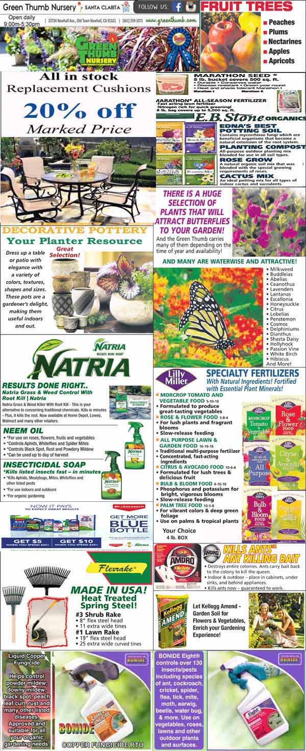 A nursery advertisement flyer featuring discounts on garden products, fruit trees, fertilizers, insecticides, planters, gardening tools, and promotions for replacement cushions.