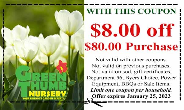 Coupon offering $8.00 off an $80.00 purchase at Green Thumb Nursery; restrictions apply; expires January 25, 2023; white tulips in background.