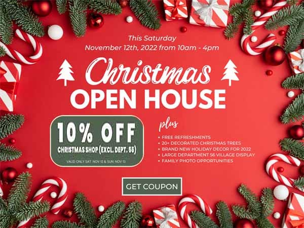 Christmas Open House event flyer with red background, candy canes, pine branches, and text offering 10% off Christmas shop and event details for November 12th, 2022, 10am–4pm.