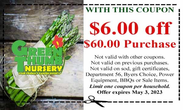 Coupon for Green Thumb Nursery offering $6 off a $60 purchase; restrictions apply. Limit one per household. Expires May 3, 2023. Image shows asparagus.