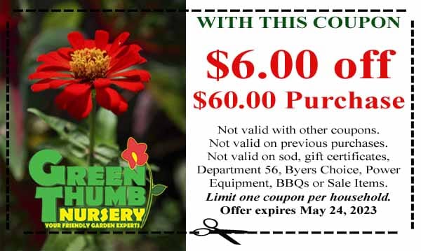 Coupon for $6.00 off a $60 purchase at Green Thumb Nursery. Restrictions apply. Offer expires May 24, 2023. Red flower and nursery logo shown.