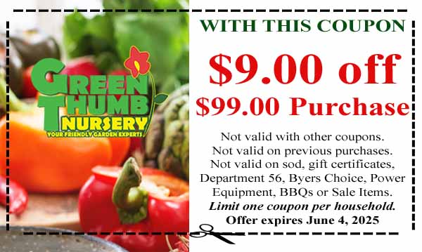 Green Thumb Nursery coupon offering $9 off a $99 purchase; exclusions and expiration date of June 4, 2025, are listed.