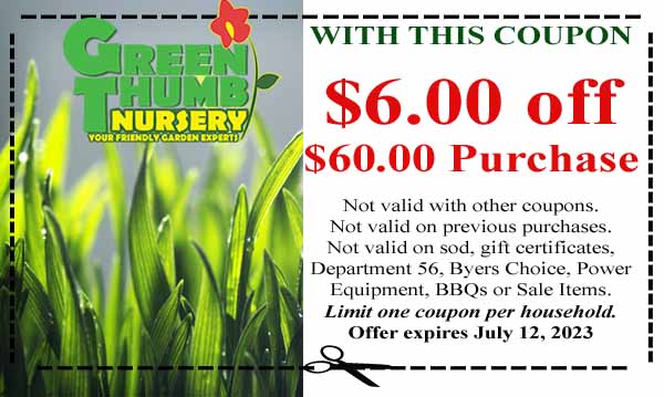 Coupon for Green Thumb Nursery offering $6.00 off a $60.00 purchase; exclusions apply; limit one per household; expires July 12, 2023.