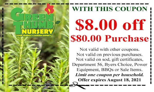 A green thumb coupon for the best garden center near me with a green thumb plant.