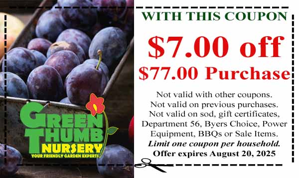 Coupon offering $7.00 off a $77.00 purchase at Green Thumb Nursery with terms and an expiration date of August 20, 2025, displayed over an image of fresh plums.