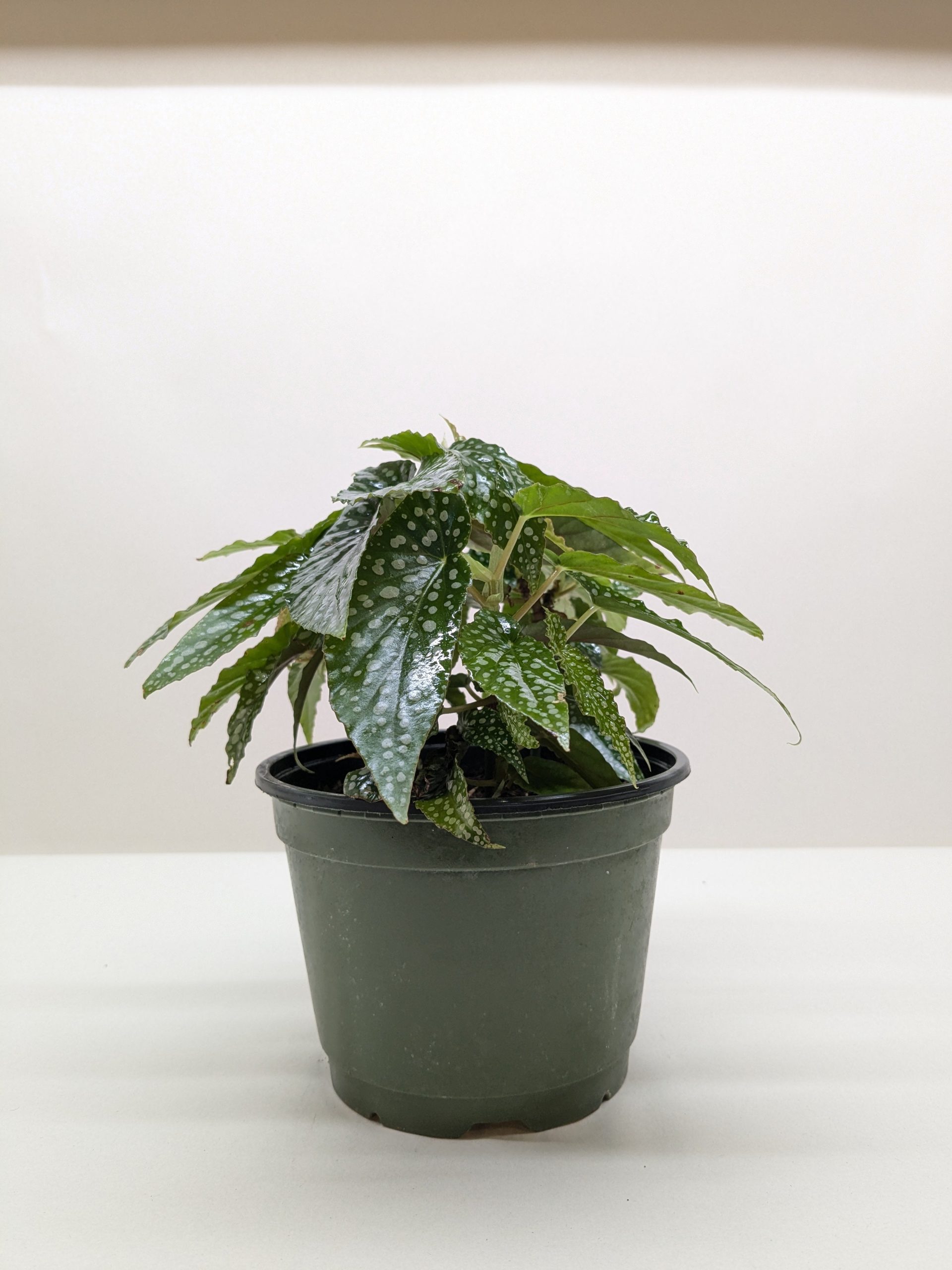 - Description: Begonia ‘White Ice’, a cane-like cultivar known for being a vigorous Begonia. Its leaves are deep green in color and covered with white spots that resemble drops of white ice.