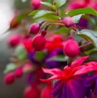 Fuchsia belongs to a genus of 105 species. These plants bloom from spring until fall. Some cultivars sprawl over the edges of containers and these are ideal for hanging baskets. Fuchsia is an excellent pollinator plant, so its nectar-rich flowers will attract butterflies and hummingbirds. Because fuchsia is susceptible to root rot, plants need fast-draining soil. If you use potting soil, add equal parts of Perlite, coconut coir, or peat moss. If you hang hummingbird feeders, you can use hanging baskets with fuchsia to block the view between feeders. That may be an effective way to prevent aggressive hummingbirds from chasing other hummingbirds away.